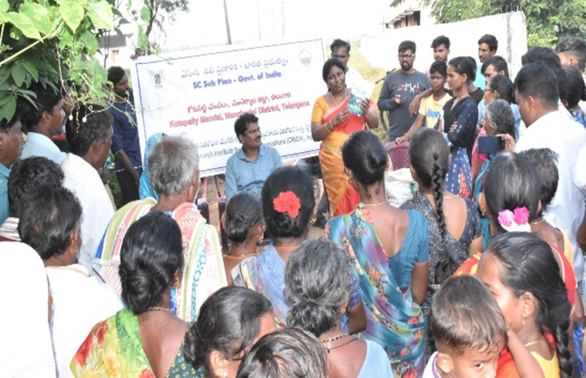 Dr. Anshida Beevi C.N. briefed about the training programmes on different topics organized by ICAR-CRIDA for the SC farmers. After that, nutri-millet kits were distributed in five villages namely Rawalpalle, Edagatta, Arjungutta, Devulawada and Pangidisomaram covering 413 SC beneficiaries. Later, the team has visited farmers’ fields to monitor the Kharif interventions and Custom Hiring Centrs