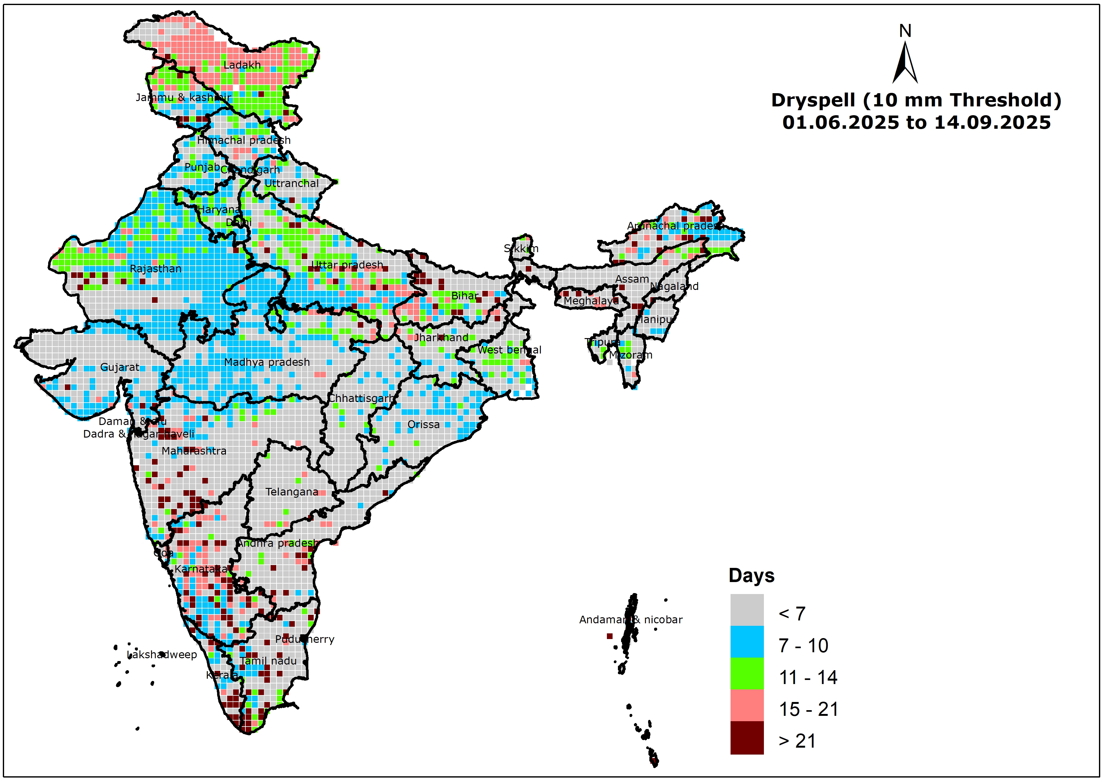 Two Days Cumulative Rainfall | Three Days Cumulative Rainfall | Fifteen Days Cumulative Rainfall | Weekly Cumulative Rainfall | Dryspell(2.5 mm Threshold) | Dryspell( 10 mm Threshold) | Daily Rainfall 14-09-2025