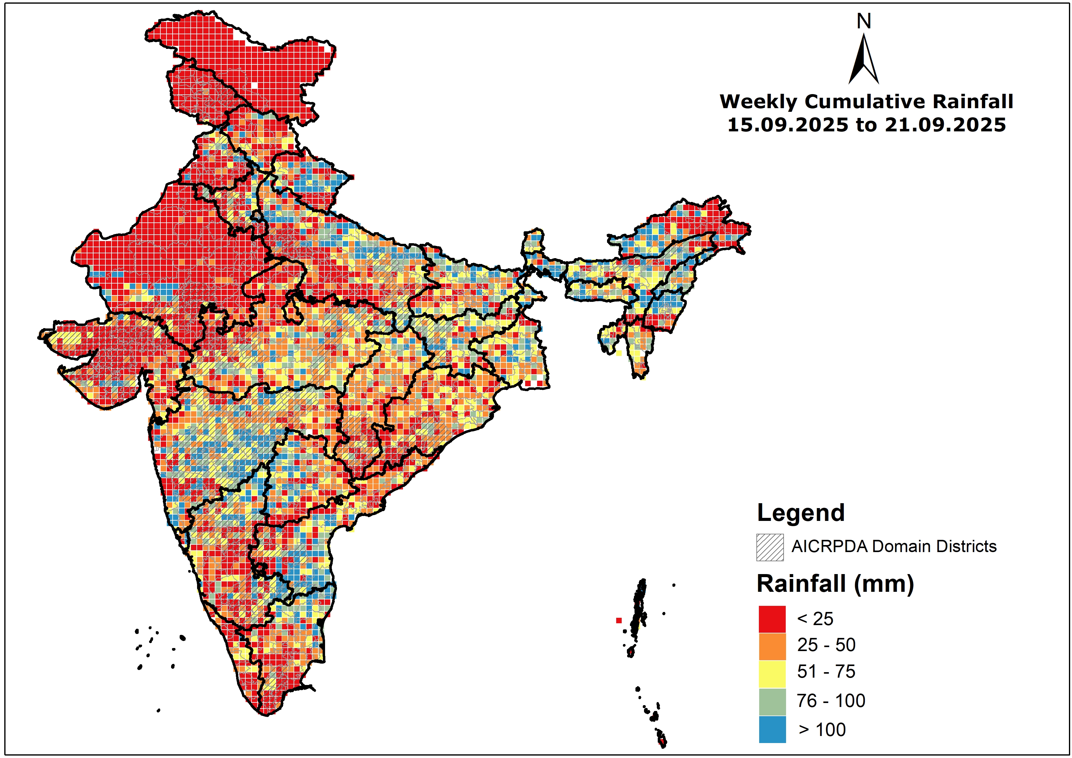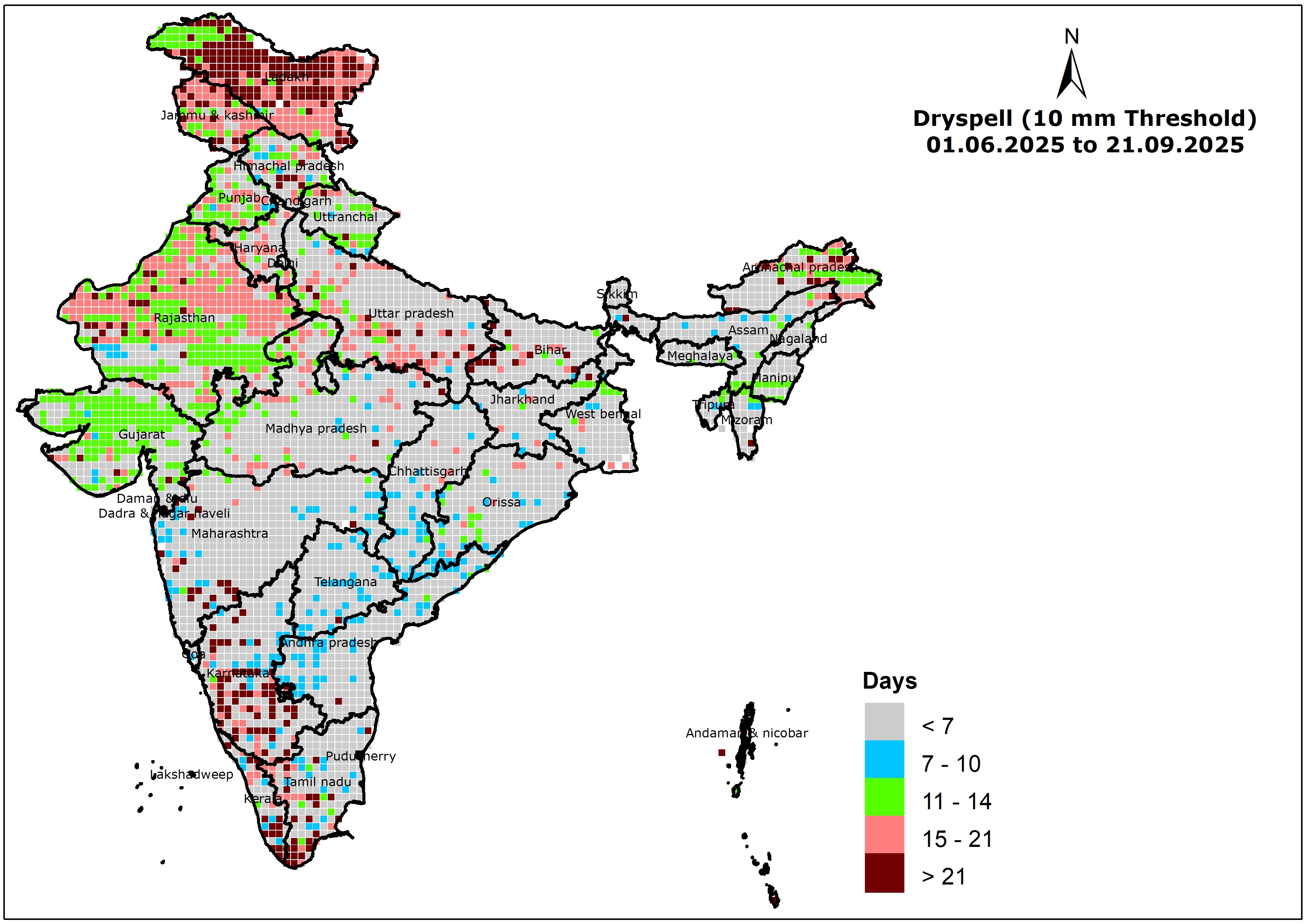Two Days Cumulative Rainfall | Three Days Cumulative Rainfall | Fifteen Days Cumulative Rainfall | Weekly Cumulative Rainfall | Dryspell(2.5 mm Threshold) | Dryspell( 10 mm Threshold) | Daily Rainfall 21-09-2025