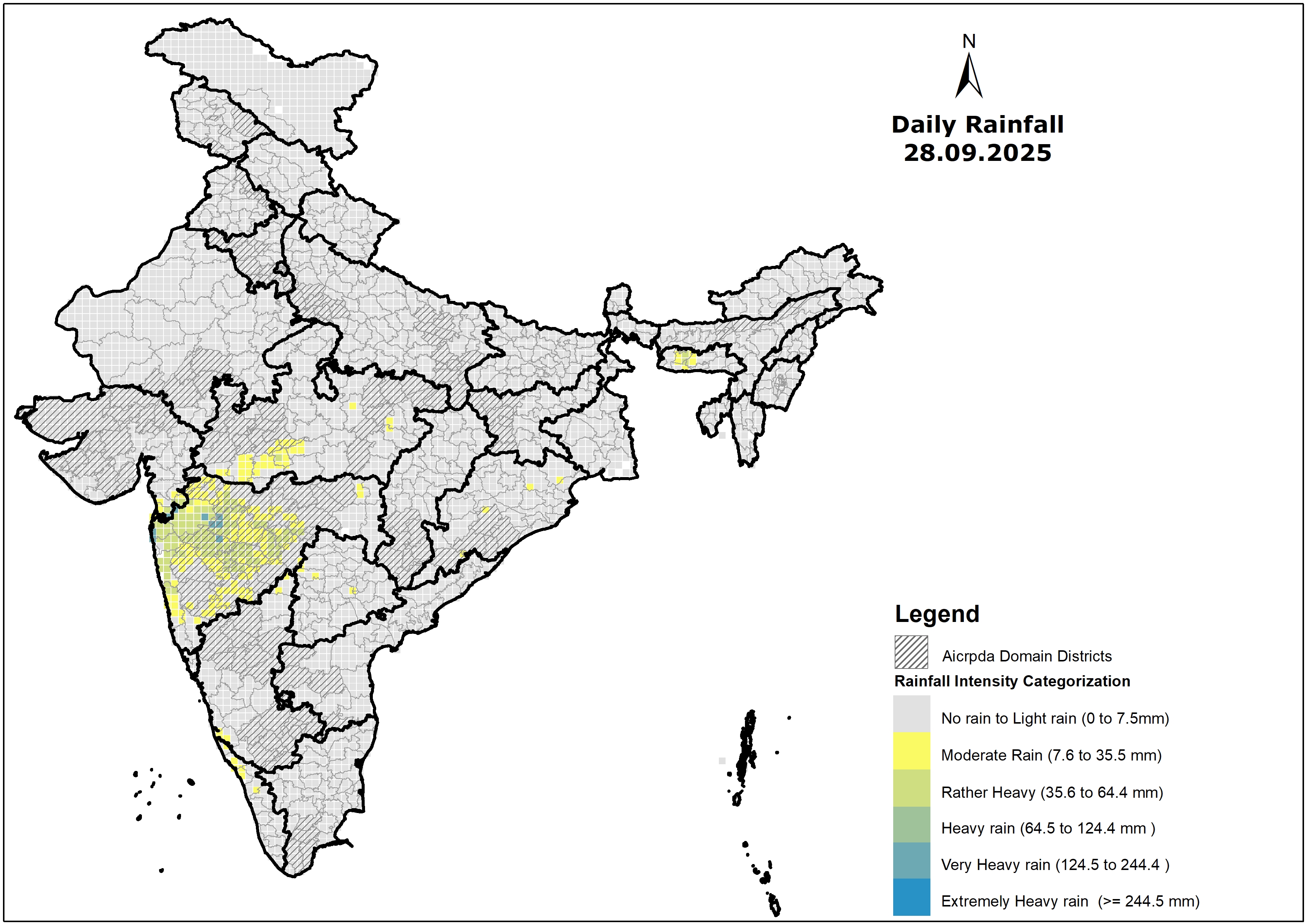 Two Days Cumulative Rainfall | Three Days Cumulative Rainfall | Fifteen Days Cumulative Rainfall | Weekly Cumulative Rainfall | Dryspell(2.5 mm Threshold) | Dryspell( 10 mm Threshold) | Daily Rainfall 28-09-2025