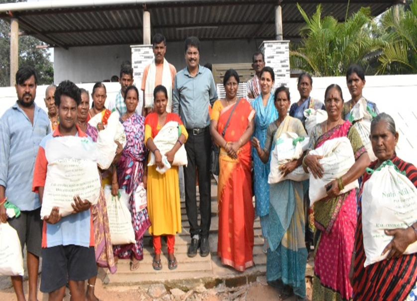 Dr. Anshida Beevi C.N. briefed about the training programmes on different topics organized by ICAR-CRIDA for the SC farmers. After that, nutri-millet kits were distributed in five villages namely Rawalpalle, Edagatta, Arjungutta, Devulawada and Pangidisomaram covering 413 SC beneficiaries. Later, the team has visited farmers’ fields to monitor the Kharif interventions and Custom Hiring Centrs