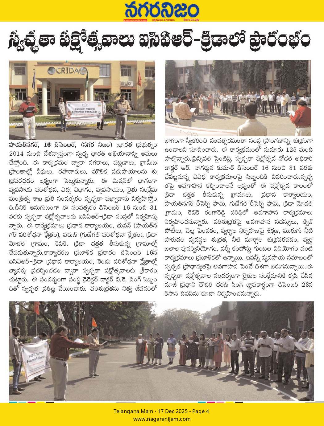 స్వచ్ఛతా పక్షోత్సవాలు ఐసిఏఆర్-క్రిడాలో ప్రారంభం